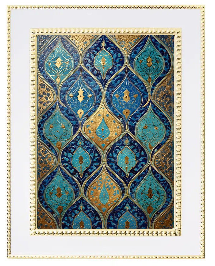 Inspired by the intricate tilework found in historic mosques across Persia and Central Asia, this blue, turquoise, and warm-gold Islamic art brings the beauty of sacred spaces into your home. Rooted in Islamic geometry, the design reflects balance, opulence, and devotion—transforming tradition into a refined statement piece.